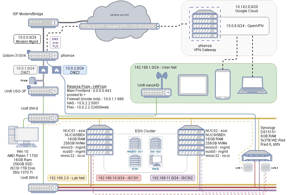 Here's a logical diagram of the network! The idea was to setup a DMZ between pfSense and Unifi. There is a concept called "defense in-depth" which has a goal to make an attacker have to penetrate various barriers before gaining access > https://www.giac.org/paper/gsec/2867/multiple-firewalls-vendors-defense-in-depth-strategy/102293. I must add-in that if not configured properly, and even when the network is configured properly, that maintenance and configuration is less about convience than it is securtiy. Hey... it is a homelab, that's fun right?!